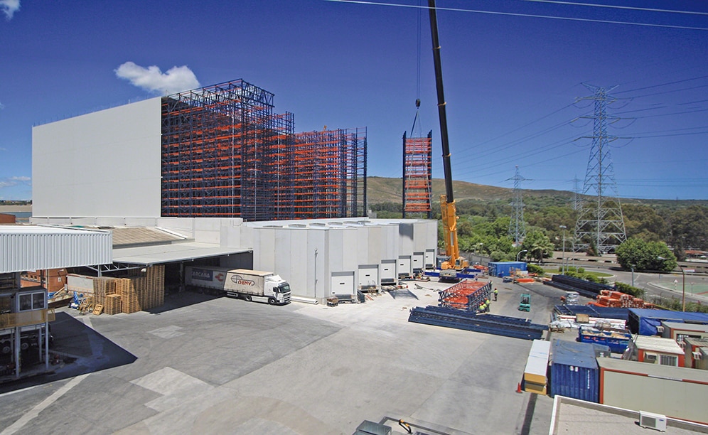 Les images permettent de distinguer les différentes phases de construction de cet entrepôt. La parfaite coordination des équipes et le fait que Mecalux soit intervenu comme fournisseur unique du projet clé en main ont permis la réalisation de ce grand entrepôt automatique intégré aux processus de production.